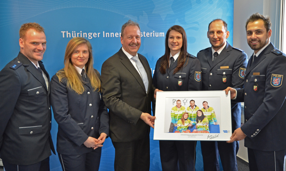 Unsere Meininger Olympioniken sind wieder da! ... Die Olympia-Rückkehrer (im Bild von links) Maximilian Arndt (6. Platz Viererbob), Stephanie Schneider (10. Platz Zweierbob), Christin Senkel (7. Platz Zweierbob), Thomas Florschütz (7. Platz Viererbob) und Andi Langenhan (4. Platz Rennrodeln) wurden in der vergangenen Woche vom Innenminister Jörg Geibert begrüßt. Der kleine Empfang für die in Sotschi aktiven Thüringer Polizeisportler sei Ausdruck von Anerkennung und Respekt für ihre großartigen Leistungen, so der Minister. Jahrelanges hartes Training mit all den privaten Entbehrungen habe sie Stück für Stück an die Weltspitze herangeführt. Die Nominierung zu den Olympischen Winterspielen sei deshalb allein schon ein Erfolg, den nur wenige Athleten je für sich verbuchen können. Auch wenn der eine oder andere Olympiateilnehmer mit dem erzielten Ergebnis nicht zu 100 Prozent zufrieden gewesen sein mag, es gebe immer wieder neue Herausforderungen. Und das Innenministerium werde auch weiterhin alles dafür tun, dass die Mitglieder der Sportfördergruppe der Thüringer Polizei sich diesen Herausforderungen unter bestmöglichen Bedingungen stellen können. Ganz besonders stolz sind wir Meininger, dass die fünf genannten als Mitglieder der Sportfördergruppe quasi Wahlmeininger sind und darüber hinaus Stephanie Schneider und Christin Senkel auf der großen Weltbühne sogar für den PSV Meiningen starten! ... GRATULATION!
