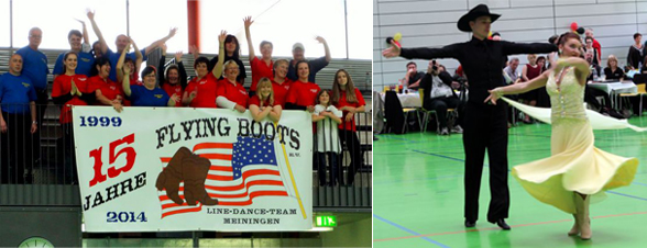 Nach der Deutschen Meisterschaft ist vor der Deutschen Meisterschaft. Nach der erfolgreichen Durchführung der DM im Country- und Westerntanz beginnen die Flying Boots e.V. Meiningen in der nächsten Woche am Mittwoch (4.11.) mit einem neuen Anfängerkurs. Der Kurs findet immer mittwochs 19.00-20-00 Uhr über 10-12 Wochen statt. Der erste Mittwoch ist eine Schnupperstunde. Gelernt werden Grundschritte, Grundtechnik und erste Tänzen im Beginner-Level. getanzt wird in der Turnhalle des evangelischen Gymnasiums in der Berliner Straße, teilnehmen kann jeder, der Interesse hat - ohne Voranmeldung. Wichtige Info: Bitte saubere Turnschuhe mitbringen! | |
